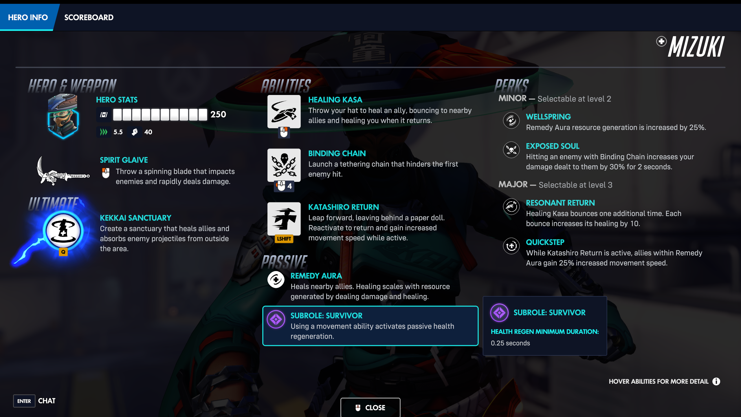 Мизуки — персонаж поддержки, сражающийся на стороне фракции Talon. Он похож на Кунг Лао в том, что использует шляпу как основную часть своего набора приёмов, но вместо нанесения урона шляпа Мизуки лечит союзников. Возможно, потребуется некоторое время, чтобы освоить его, но он кажется универсальным и может хорошо вписаться во многие командные составы. Кроме того, бросать шляпу товарищам по команде — это просто весёлый маленький бонус!