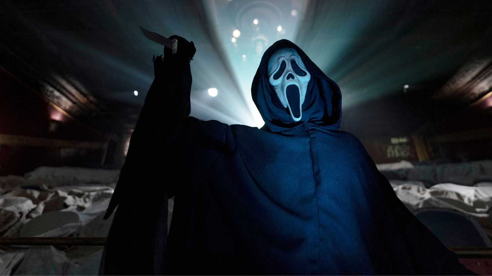 Фильм начинается со, казалось бы, случайной сцены: пара посещает фальшивый «дом с убийствами», спроектированный так, чтобы выглядеть точно как дом детства Сидни Прескотт. В нем есть очертания тел, нарисованные мелом, и даже роботизированный Призрак, предназначенный для того, чтобы напугать зрителей. Но затем появляется настоящий Призрак.